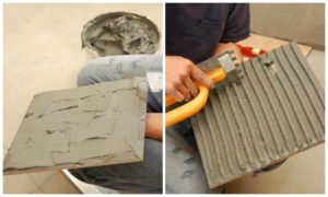 Эта процедура делается с помощью двух шпателей – плоского и зубчатого. Сначала можно положить небольшое количество клея плоским шпателем, а потом разравнять его зубчатым. Слой клеевого состава может быть различным, но обычно он становит около шести-восьми миллиметров.