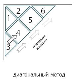 Если вы ходите воспользоваться диагональным методом, то выложите прямой ряд. Далее необходимо выложить треугольники широкой стороной вниз. С помощью шнура-причалки определите угол в сорок пять градусов и кладите детали следующего ряда. Так до верха печи. Предпоследний ряд у вас должен быть таким как второй, а последний – как первый.