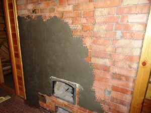 - Грунтовка стен печи. Для грунтования стены можно использовать различные составы, которые предлагают в специализированных магазинах. После высыхания грунтовки можно наносить штукатурку, предварительно смочив поверхность водой. Слой покрытия должен быть достаточно большим, чтобы скрыть всю сетку. Выровнять слой можно с помощью отвеса. После высыхания слоя шпаклевки, можно извлечь саморезы, а образовавшиеся углубления заделать грунтовкой. После этапа грунтования следует немного протопить печь. Так укладывать клинкерную плитку будет гораздо проще.