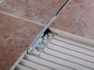 - Ряды начинаем укладывать снизу. Для предотвращения сползания и защиты во время эксплуатации закрепляем снизу специальный, перфорированный уголок по разметке. Крепим уголки на дюбеля с саморезами. Шаг между крепежными отверстиями 200-250 мм. Все углы печи закрываем такими же деталями. Это позволит выровнять все поверхности, защитить углы от сколов и надежно закрепить плитку.