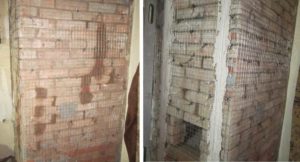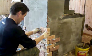 - Очищаем поверхности печи от раствора и слоя штукатурки. Швы между кирпичами разделываем на глубину от 10 мм, для лучшей фиксации плитки на поверхностях. Если использовался раствор глины и песка, можно поставить на болгарку металлическую щетку, но пыли будет очень много;